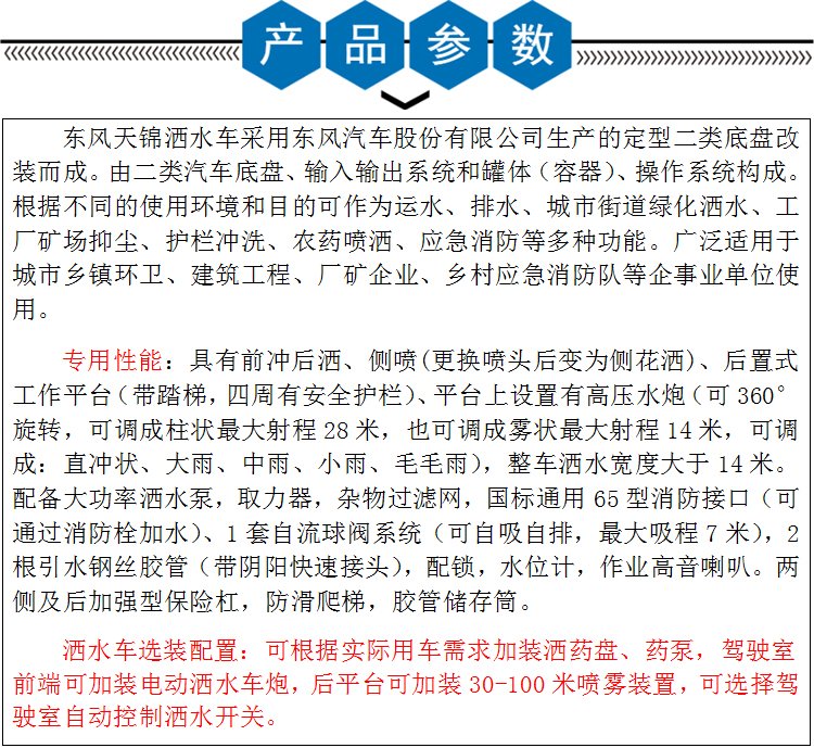 洒水车:又名公路养护洒水车,绿化喷洒车,是城市保洁,工程养护,道路清洗,绿化工程的必备车型。该系列车型,配备了前冲,后洒,侧喷,后自流阀,后消防栓接口和绿化炮。独有设计的多功能绿化平台,可活接1寸口径的各类软水管,是各类工程作业的必备工具车。成立以来,我们企业设计生产的各类洒水车产品,先后参与如三峡葛洲坝建设,南水北调,高铁建设等大型建设项目,并多次输送世界各地,支援战后国家重建