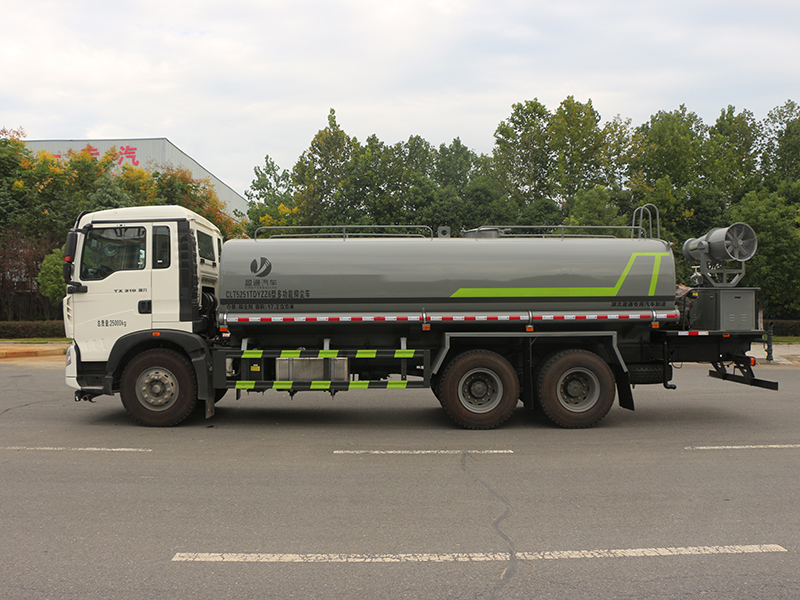 标准配置洒水车主要装备有:前冲(冲洗公路路面)、后洒(公路路面养护)、侧喷、高位侧花洒(路边绿化带优化);后工作平台高压水炮,可调节成柱状,射程≥28m;也可调节成雾状,射程≥30米,水泵自吸高度:≤7m,洒水宽度:≥15m。侧防护网,自流阀,消防接头。洒水车水泵为常压水泵,功能可以抽水、排水。另外根据用户要求,可加消防泵、喷雾机、农药卷盘、农药柱塞泵。罐内可以做防腐防锈、电磁阀气动阀自动放水等****,以满足不同用户需求。
