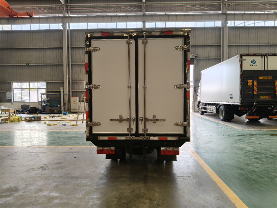 厢体工艺: 厢体材质采用内外玻璃钢,中间XPS保温板,后双开门,厢体右侧靠前选装开侧门,底部采用花纹防滑铝板,前部排水孔,门边条采用迷宫式橡胶密封条,铝合金型材包边,不锈钢包角,不锈钢门锁,不锈钢门框及合页,厢体内节能LED照明灯。