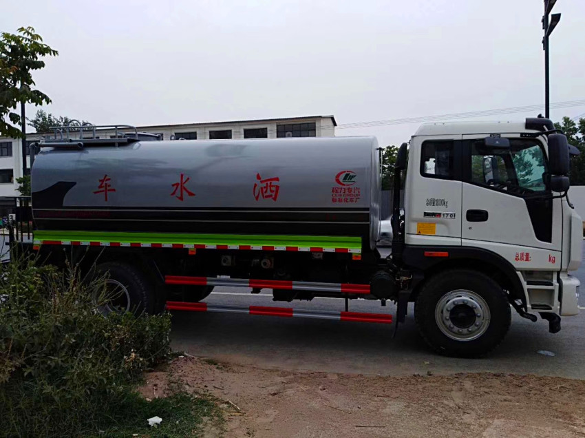 福田洒水车随底盘选装驾驶室;侧喷为选装件;品名:水;密度:1000千克/立方米;有效容积:12立方米;轴距3950mm时,罐体外形尺寸(长×长轴×短轴)(mm):4600×2180×1390,外形尺寸长(mm)/前悬(mm)对应关系:7700/1250,7900/1450;轴距4500mm时,罐体外形尺寸(长×长轴×短轴)(mm):5200×2080×1290;外形尺寸长(mm)/前悬(mm)对应关系8250/1250,8450/1450;ABS型号为3631010-C2000,生产厂家为东科克诺尔商用车制动系统(十堰)有限公司;侧面防护装置材料材质:Q235,连接方式:焊接;后下部防护装置材料材质:Q235,连接方式:焊接,断面尺寸(宽×高):30×120(mm),离地高度:500mm. 吸程≧7米,洒水宽度≧14-16米,射程≧25-30米,引水时间<5min,流量60m3/h。前冲(喷)、后洒、带侧喷(花洒)、带后工作平台、平台上安装绿化洒水高炮(炮喷射形状可调节:直冲、大雨、中雨、毛毛雨、雾状、可连续调节,360°旋转),配消防接口,自流阀,滤网,带自吸自排功能。配备大功率专用洒水泵,泵可自吸自排,安装过滤网,带消防接口,可通过消防栓进水,带自流阀,随车选装20米绿化卷盘,可喷洒农药,罐体金属漆。罐体有椭圆和方圆罐两种,可根据用户的要求定做,了解洒水车价格,福田12吨洒水车报价,可以联系程力洒水车生产厂家,陶经理