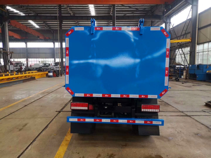 挂桶垃圾车箱体装置:厢体选用优质碳钢,边三底四,内部采取环氧树脂防腐处理。厢体设计为密封式结构,在箱体前部设有进料箱盖,侧面设有自装料装置,箱体后部设有卸料门。