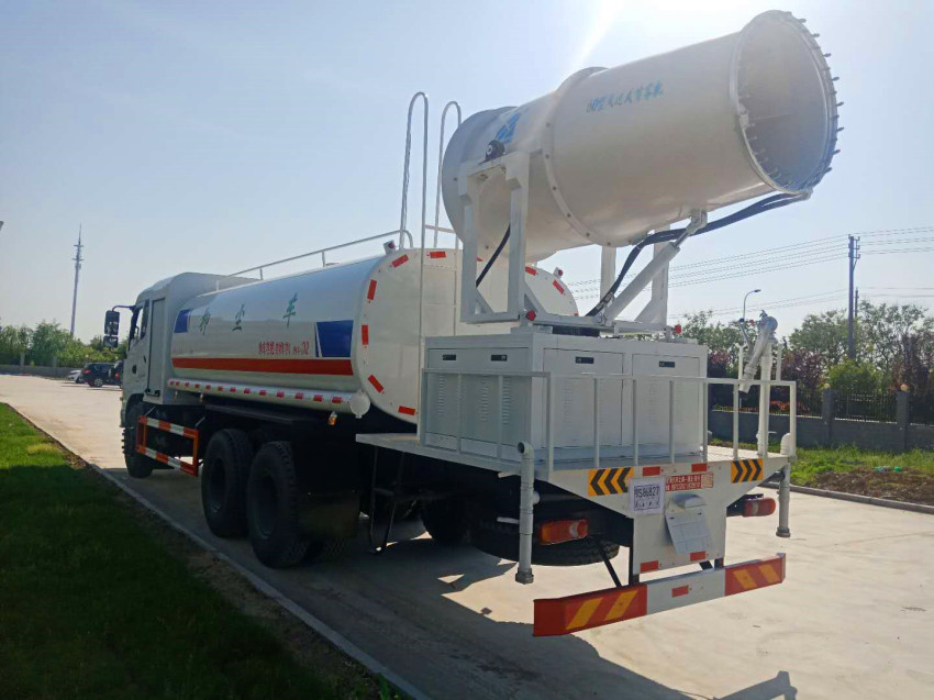 喷雾降尘车个头近似普通卡车,它的抑尘效果却十分惊人,工作效率约为普通洒水车的30倍。据技术人员介绍,一台喷雾降尘车的工作直径可覆盖4个标准足球场。水箱中的水经过雾化后,由高压风机喷出。相比普通洒水车喷出的水流,水雾颗粒极为细小,达到了微米级,其吸附力也增加了3倍,耗水量却降低了70%,遭遇雾霾天气、空气质量PM2.5严重超标时,可随意选定一个区域进行液雾降尘、分解淡化空气中的颗粒浓度、将飘浮在空气中的污染颗粒物、尘埃等迅速逼降地面,达到清洁净化空气的效果。