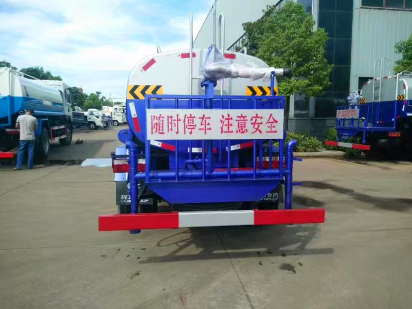 洒水车前装有鸭形喷嘴或圆头冲嘴,后面装有圆柱开洒水喷嘴或莲蓬头喷嘴,后部有一工作平台,装配有水炮。带消防接头,带自流阀,带自吸功能,选配20米绿化消防卷盘。
