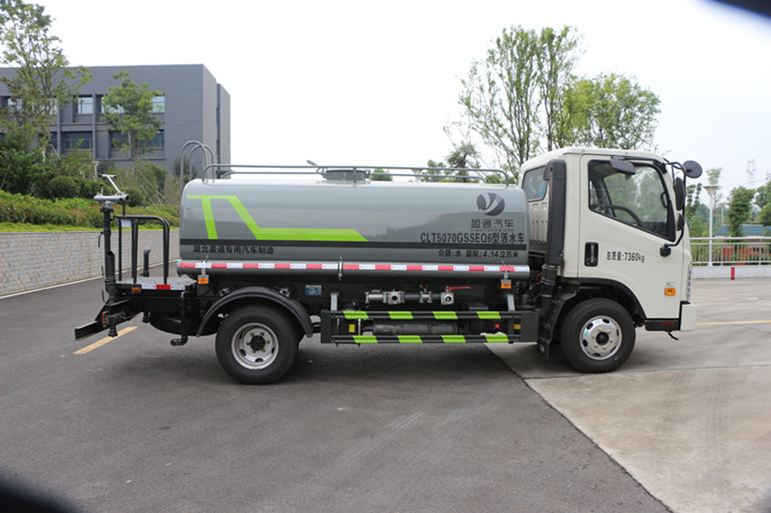 该洒水车安装罐体,管道系统,操作系统,洒水泵,取力器,通过传动轴带动水泵完成洒水工作;罐体有效容积:4.05立方米,罐体外形尺寸(长/长轴/短轴)关系为(mm):3400/1600/1100;防护材料:Q235A碳钢,连接方式:左右侧面及后下部防护均采用焊接连接,后部防护断面尺寸(mm):100×50,后部防护离地高度(mm):450,ABS型号:J ABS;ABS生产厂家:焦作博瑞克控制技术有限公司,该车随底盘扩展驾驶室。