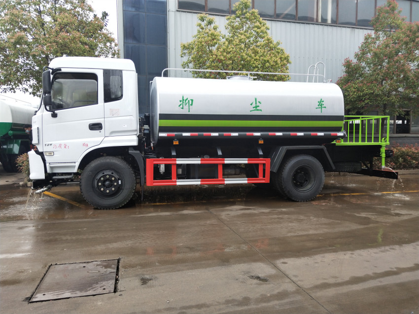 东风御虎12吨洒水车 罐体采用武钢优质碳钢板,采用国标5mm厚制作,罐体内设有隔浪板,具有防波浪作用,以减低汽车行驶时,对罐体的冲击,射程可达35米,垂直吸程≥7米,洒水宽度≥14-16米,带自吸自排功能,消防栓接口,前冲,后洒,侧喷,后工作平台带绿化水炮,绿化洒水炮(喷射形状可调)直冲状、大雨、中雨、毛毛雨,可连续调节,自流阀,三通滤网,大功率洒水泵,2根3米输水管,金属漆,其它洒水车标配。