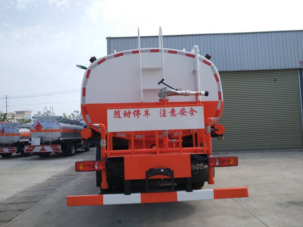 该车用于园林绿化,除尘和降温作用的罐式专用作业汽车;罐体有效容积:14.8立方米,运输介质:水,密度:1000千克/立方米,罐体外形尺寸(长度×长轴×短轴)(mm):7400×2100×1380,6100×2350×1500,6580×2280×1430。整车长/轴距/前悬/后悬对应关系为(mm):10050/4350+1350/1440/2910,10580/4750+1350/1440/3040。仅采用4350+1350,4750+1350轴距底盘。防护材料:Q235碳钢,连接方式:侧后防护装置均采用焊接连接,后部防护断面尺寸(mm):120×50,后部防护离地高度(mm):490。3, ABS型号/生成厂家:3631010-C2000/东科克诺尔商用车制动系统(十堰)有限公司.随底盘选装驾驶室.选装后高位花洒,选装方圆管道箱,选装后雾炮装置,选装后弧形喷雾.选装LED箭头指示灯,选装后平台式样,选装喷枪安装位置。
