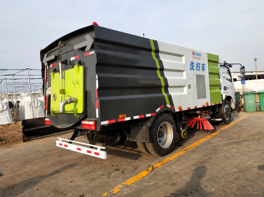 扫路车主要是对路面进行清扫和垃圾收集,通过扫刷将垃圾清扫到吸盘处吸进垃圾箱从而对路面进行清扫。在清扫的时候,由扫盘上部弧形喷嘴喷雾降尘。扫路车还可以加装洒水前冲后洒功能,用来冲洗路面。