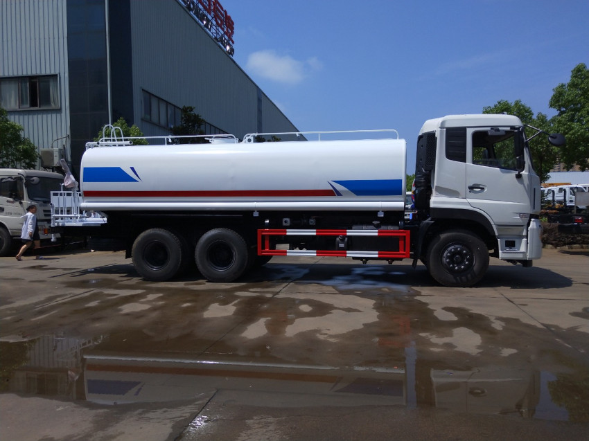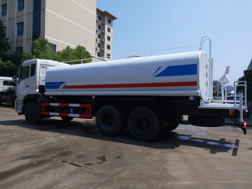 东风20吨洒水车选装驾驶室.选装后高位花洒,选装方圆管道箱,选装后雾炮装置,选装后弧形喷雾.选装LED箭头指示灯, 选装后平台式样,选装喷枪安装位置。仅采用4350+1350轴距底盘。罐体有效容积15.58立方米;整车长 /前悬/后悬对应关系(mm): 10100/1480/2920,10100/1500/2900,10500/1480/3320,10500/ 1500/3300;罐体外形尺寸(长×长轴×短轴)(mm):6500×2280×1550。侧防护采用Q235,螺栓连接。 后防护采用Q235,焊接连接。后防护截面高度尺寸120mm,截面宽度尺寸50mm,下边缘离地高度500mm。 ABS型号/生产厂家:3631010-C2000/东科克诺尔商用车制动系统(十堰)有限公司,ABS 8/ 东科克诺尔商用车制动系统(十堰)有限公司,4460046450/威伯科汽车控制系统(中国)有限公司。 专用装置主要是罐体和喷洒系统,用于园林绿化,喷洒作业. |