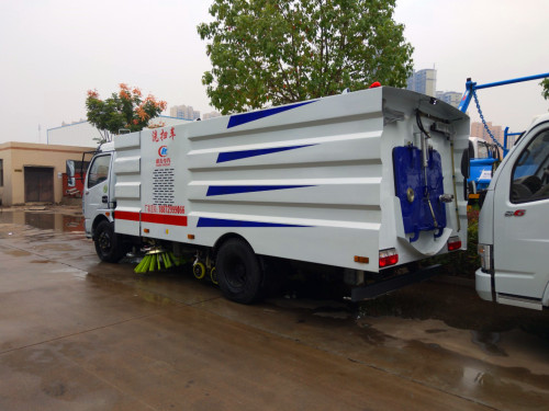 东风多利卡洗扫车采用东风型国五二类底盘改装,加装副发动机、风机、高压水泵、清水箱、垃圾箱、左右立扫、带喷水杆的宽吸嘴、低压冲洗系统、垃圾箱自洁,扫盘降尘系统,液压系统、专用装置电控系统和副车架等改装而成: