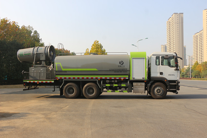 20吨洒水车罐体尾部采用大平台,可搭载30米车载式风送喷雾机组,具有功力强、射程远、穿透力强、雾粒附着力强、覆盖范围广、可以实现精量喷雾等特点,适合风沙抑尘、工地降尘、拆迁降尘,专门用于城市开发区建设工地、拆迁工地、车站储煤场、洗煤厂、焦化厂、铁矿、钢厂、港口等的扬尘风沙控制;在城市遭遇雾霾天气、空气质量PM2.5严重超标时,可随意选定一个区域进行液雾降尘、分解淡化空气中的颗粒浓度、将飘浮在空气中的污染颗粒物、尘埃等迅速逼降地面,达到治理净化空气的明显良好效果。