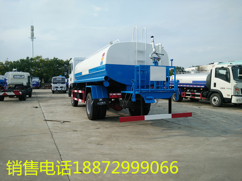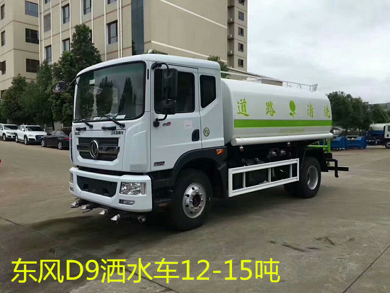 东风D9洒水车(12吨)罐体用4MM碳钢板制作,罐内隔板具有防波作用,整车带一个专用洒水泵(垂直最大吸程6米),洒水宽度14米,射程28,配备2个前冲、2个后洒、2个侧喷、带1个后工作平台,平台上安装1个绿化洒水高炮(洒水炮可全方位旋转,可连续调成直冲状、大雨、小雨、毛毛雨,雾状可调节冲洗高大树木),引水时间<5min,流量90m3/h。带1个消防接头,带1个自流阀,1个过滤装置、人性化爬梯及侧防护栏,安装洒水音乐喇叭。